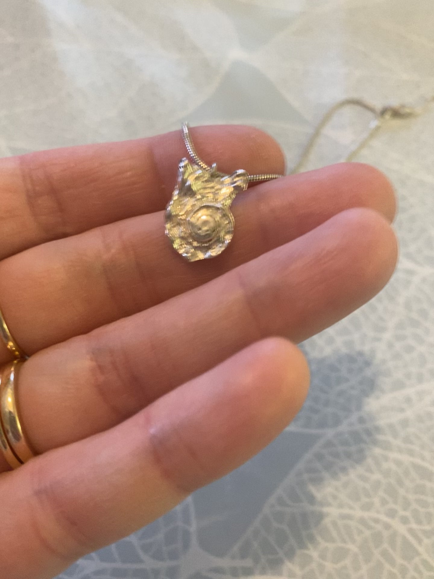 This Silver Shell Pendant is expertly crafted from sterling silver, cast from a real shell handpicked from a beautiful Cornish beach. The pendant captures the natural beauty and texture of the shell, preserving its unique form in fine silver. Whether you’re drawn to the sea or looking for a coastal-inspired accessory, this pendant is a perfect way to carry a piece of the beach with you.