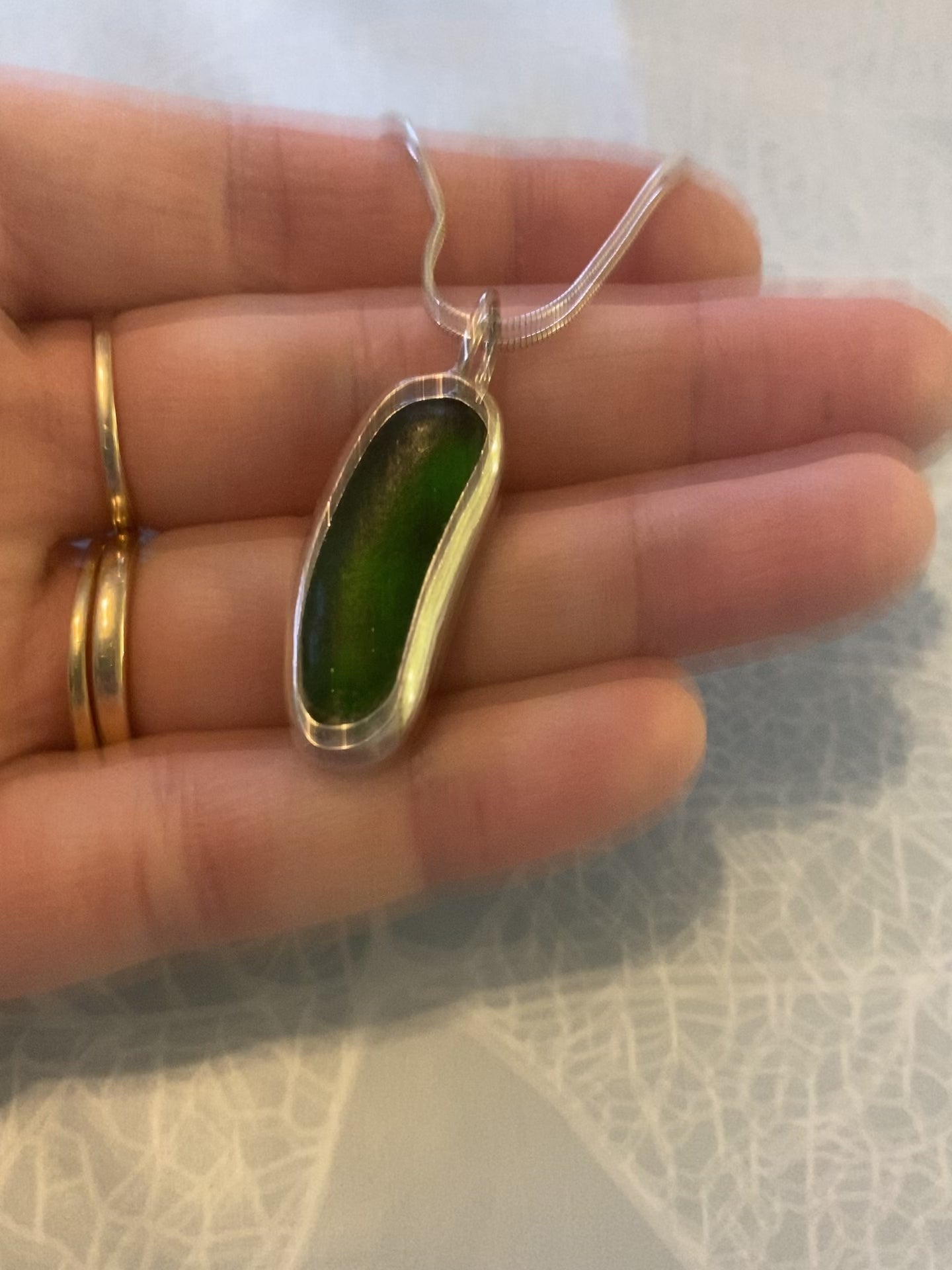 Discover the timeless beauty of our Genuine Sea Glass Pendant, a unique piece of eco silver jewellery that captures the spirit of the ocean. This pendant features a stunning piece of hand-harvested sea glass, collected from the beautiful South Devon coast by myself and my family. The sea glass, with its naturally smooth and frosted texture, is set in sterling silver to create a one-of-a-kind charm that reflects the rich hues of the sea.