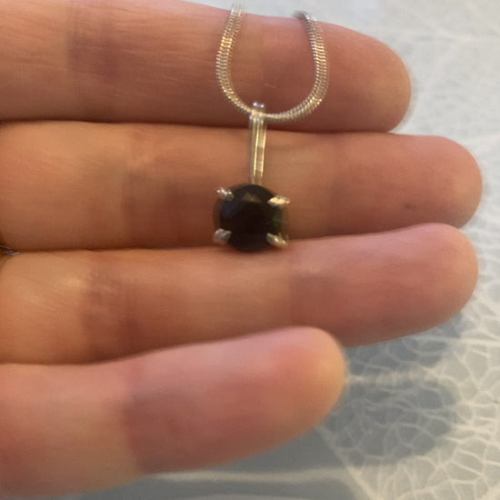 This Sapphire Pendant features a 10mm dark blue sapphire, with a stunning near-black hue that exudes elegance and sophistication. Set in a classic sterling silver setting, the faceted finish of the sapphire enhances its natural sparkle, creating a truly special and eye-catching piece. This one-of-a-kind pendant is a perfect addition to any jewellery collection, offering both a timeless design and a striking depth of colour.