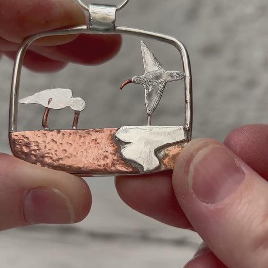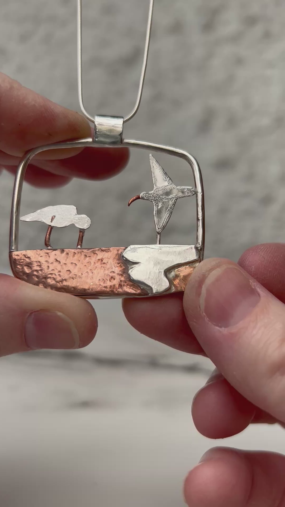 Experience the captivating blend of craftsmanship and nature with the Oystercatcher Kinetic Necklace. Expertly crafted from sterling silver, copper, and brass, this stunning piece features an interactive design inspired by the natural world. With a choice of chain styles, you can wear a unique piece that moves with you.